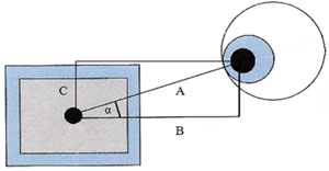 Важнейшим фактором, влияющим на развитие компьютерного зрительного синдрома, является угол взора. Угол взора (α) — это угол между линиями, соединяющими центр монитора с глазом (А) и горизонталью. Снижение частоты развития симптомов отмечается при угле более 14 градусов.
